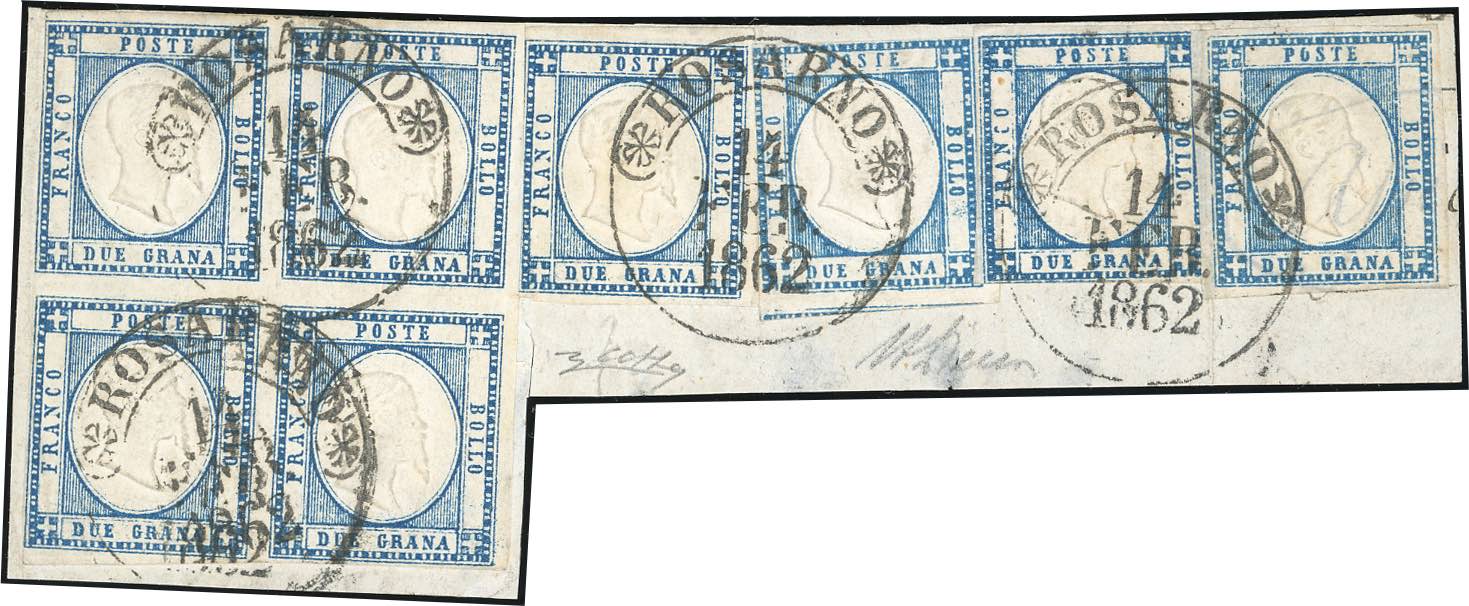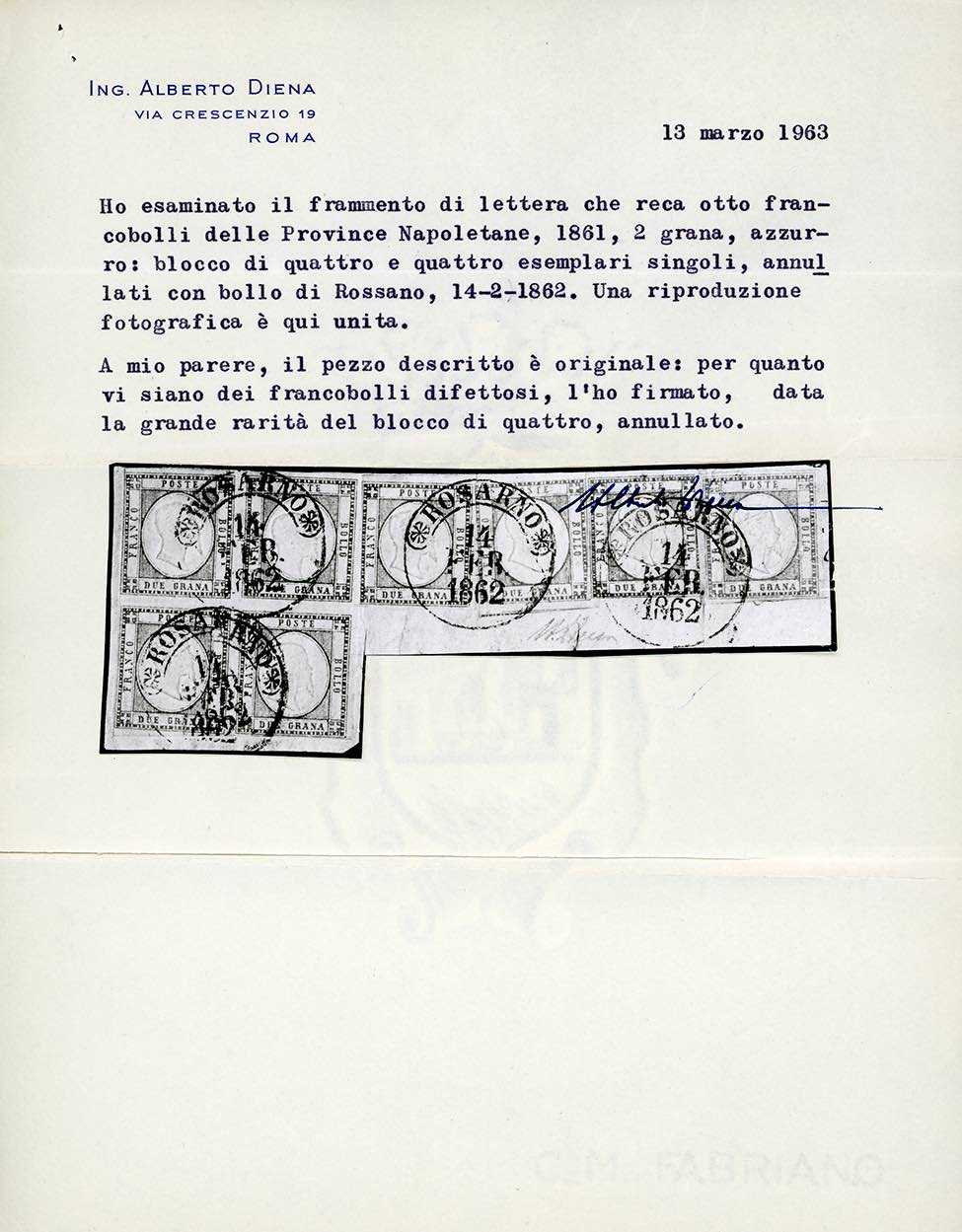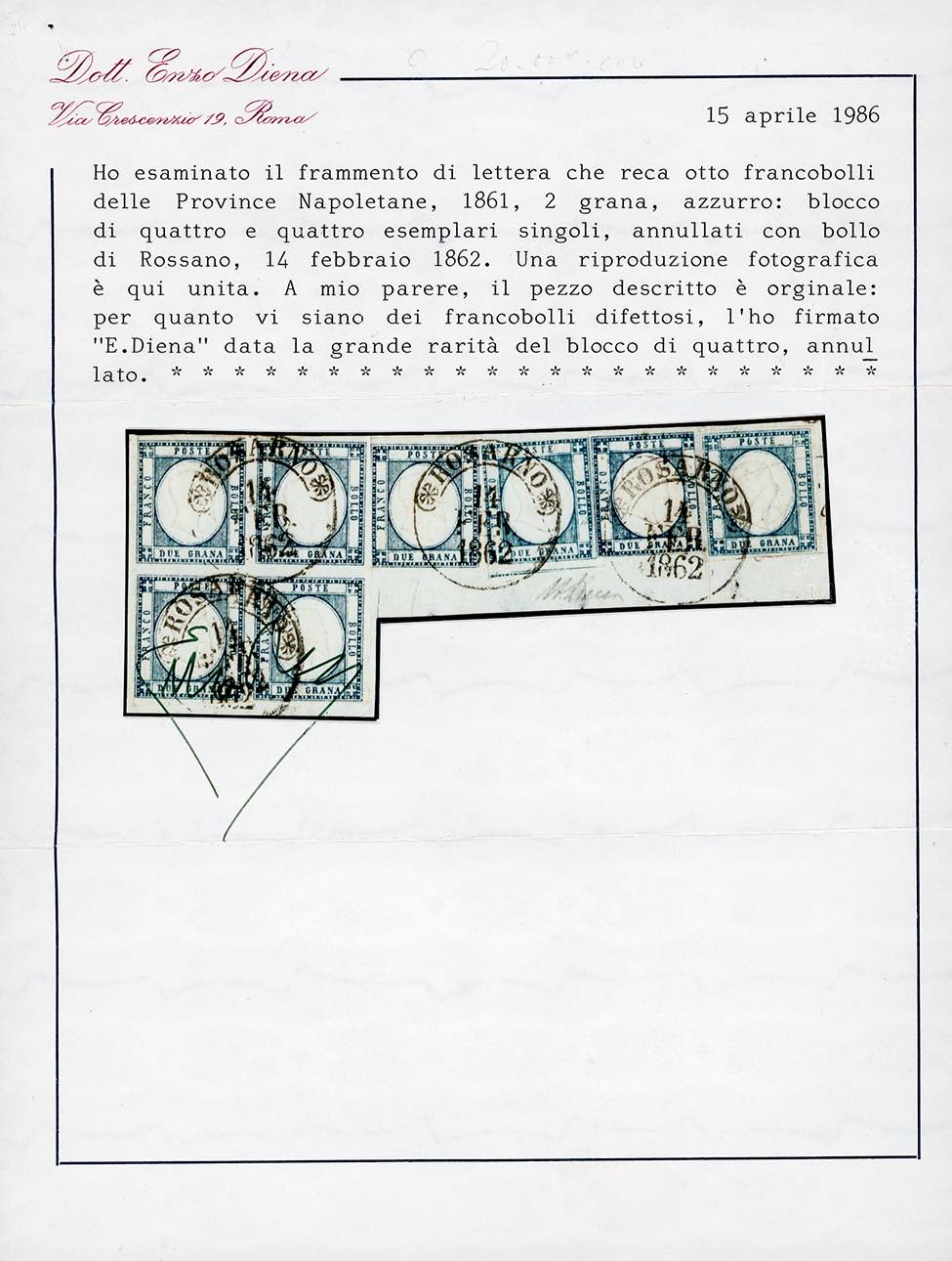 1861 - 2 grana azzurro (20b), blocco di quattro e quattro esemplari singoli, lievi difetti, usati su frammento a Rossano 14/2/1862. Raro. Colla. Cert. Alberto e R.Diena.