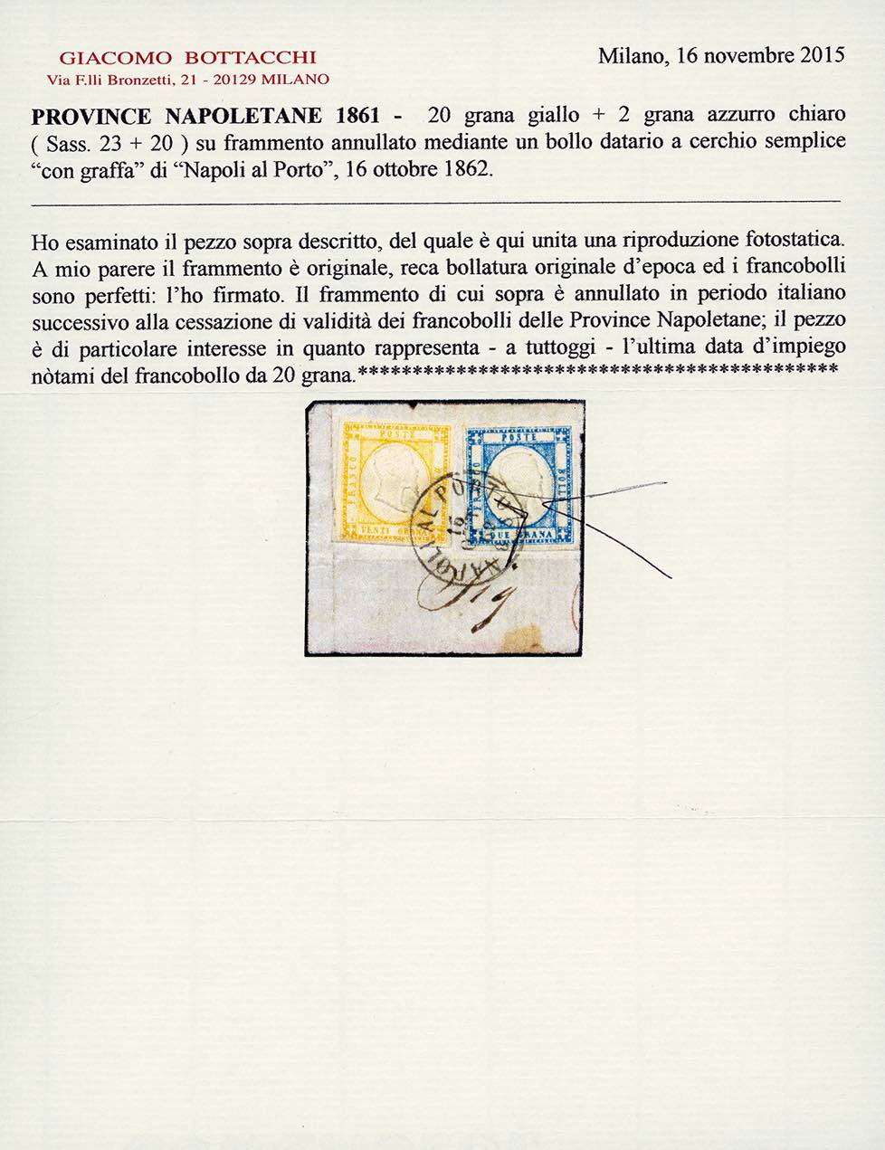 1861 - 20 grana giallo e 2 grana azzurro chiaro (23,20), perfetti, usati su frammento a Napoli 16/10/1862. Raro utilizzo dell'emissione per le Province Napoletane dopo il periodo di tolleranza e ultima data d'uso nota del francobollo da 20 grana. Cert. Bottacchi.