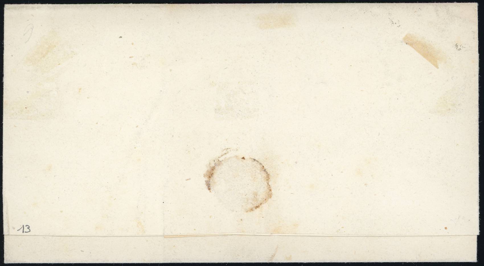 GIOJA, svolazzo tipo 1 cerchio rosso punti 13 - 2 grana (7e), perfetto, su sovracoperta del 24/2/1861 per Trani. Rara. Sassone, cert. Sorani.