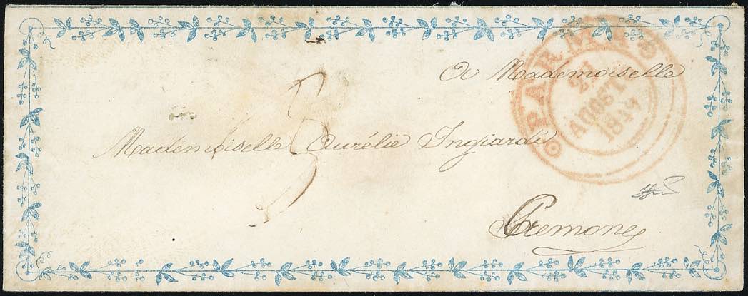 1849 - Splendida busta valentina da Parma 22/8/1849 a Cremona, segni di tassa al fronte/verso. Rarissime le valentine del Ducato di Parma! Ferrario.