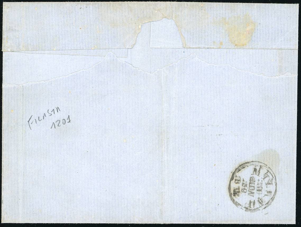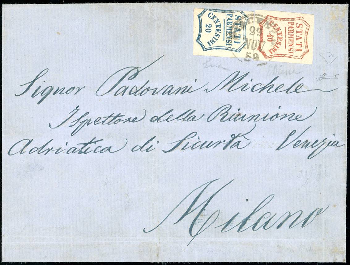 1859 - 40 cent. rosso bruno, I composizione, perfetto, con margini eccezionali, 20 cent. azzurro, corto a sinistra (16,15), su fresca sovracoperta di lettera da Piacenza 29/11/1859 a Milano, bollo d'arrivo. Uno dei migliori esemplari noti su lettera del raro 40 cent. Em. ed E.Diena, cert. Ferrario.