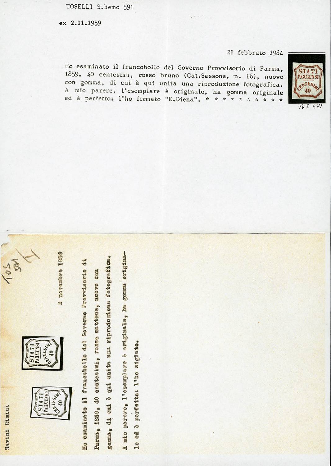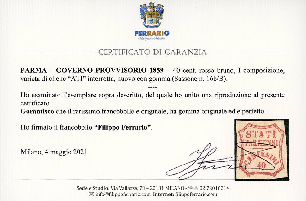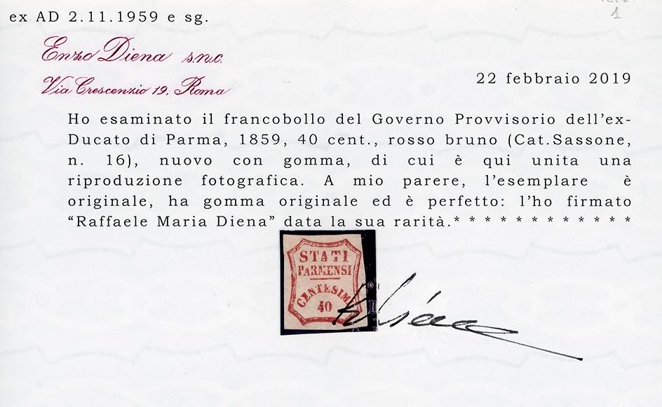 1859 - 40 cent. rosso bruno, I composizione, varietà di clichè "ATI" interrotta (16b/B), gomma originale, perfetto. Molto raro! A. ed E.Diena, Sorani. Cert. Diena.