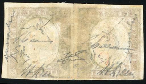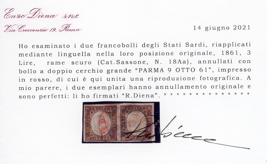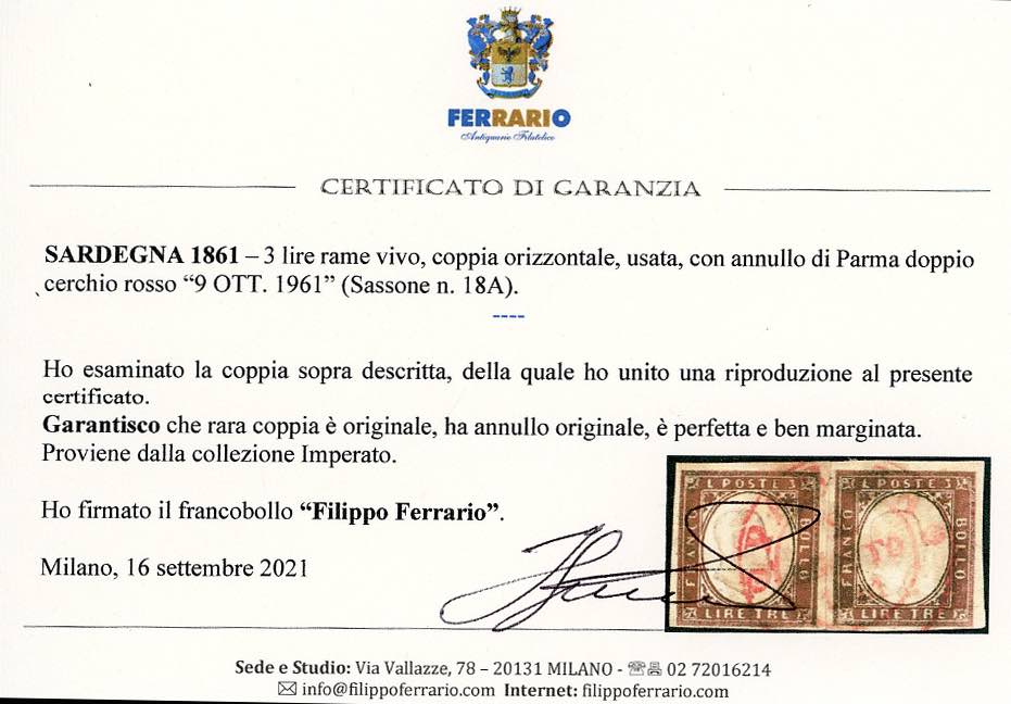 PARMA, d.c. rosso - 3 lire rame vivo di Sardegna (18A), coppia perfetta e ben marginata con annullo centrale di Parma 9 OTT. 1861. Splendida e probabilmente unica. Ex collezione Imperato. A.Diena, Enzo Diena, cert. Diena e Ferrario.