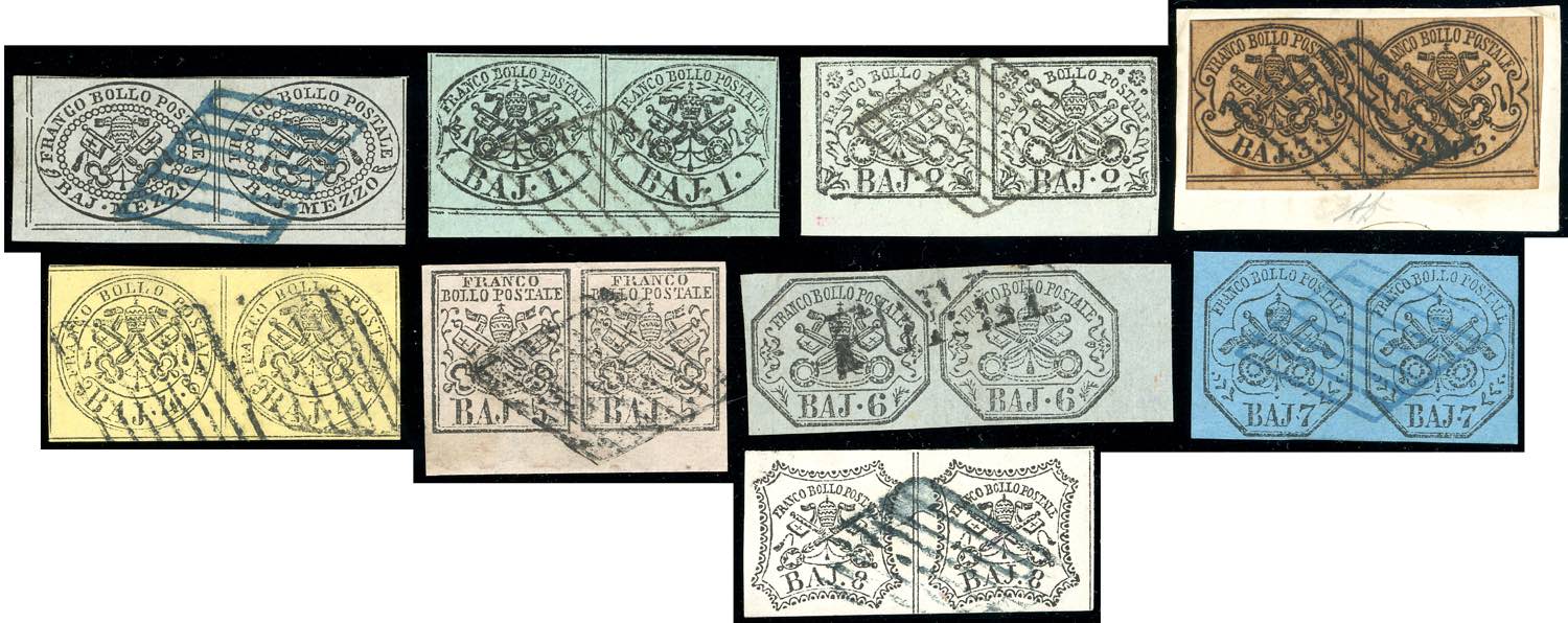 1852 - Serietta tipo di nove valori, nei colori più comuni (1/8), in coppie orizzontali usate, diverse con bordo/angolo di foglio, tutte perfette e di ottima qualità. Bell'insieme.