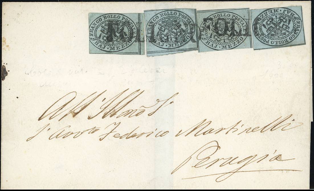 1854 - 1/2 baj grigio azzurro (1a), quattro esemplari, tre stampati con inchiostro nero oleoso, difetti di marginatura, su sovracoperta di lettera da Gualdo Tadino a Perugia 27/11/1854. Interessante combinazione di valori gemelli.