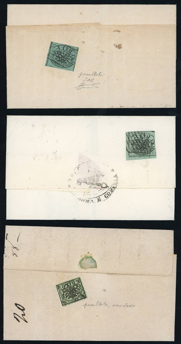 1860/61 - Tre lettere da Roma a Castelnuovo di Porto tassate con francobolli preannullati (2f,2Ab,3e), tutti con annullo a griglia. ... Leggi tutto