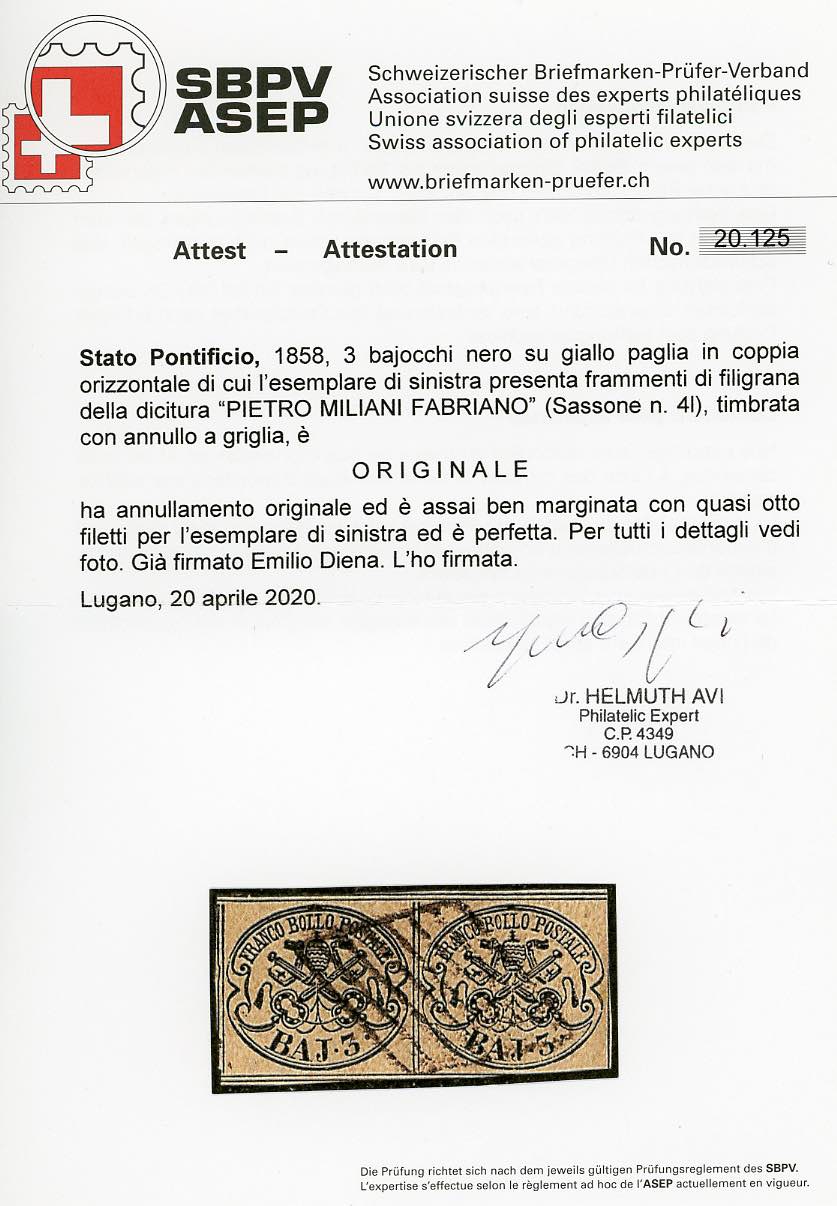 1858 - 3 baj giallo paglia, coppia orizzontale, il primo esemplare con frammenti di filigrana "Pietro Milani Fabriano" (4l), usata, perfetta. Rara. Cert. Avi.