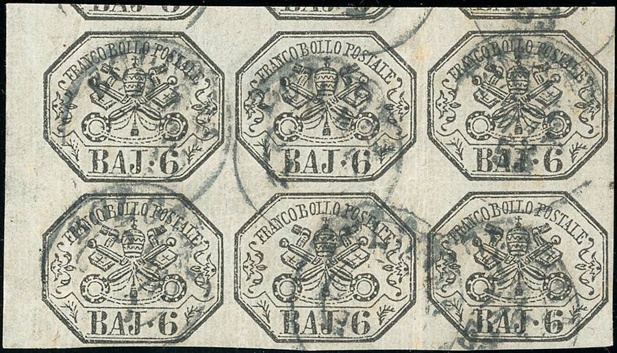 1852 - 6 baj grigio (7a), blocco di sei, bordo di foglio a sinistra, perfetto, impercettibile grinza di applicazione su un esemplare, usato con bollo datario di Bologna. Raro. Cert. Ferrario. Ex coll. Imperato. (cat. Sassone ? 10.500 per il blocco di quattro)