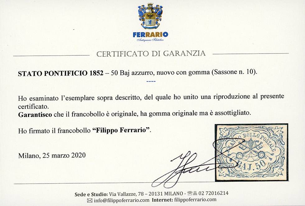 1852 - 50 baj azzurro (10), gomma originale, assottigliato. Molto fresco, ottimo aspetto. Cert. Ferrario.