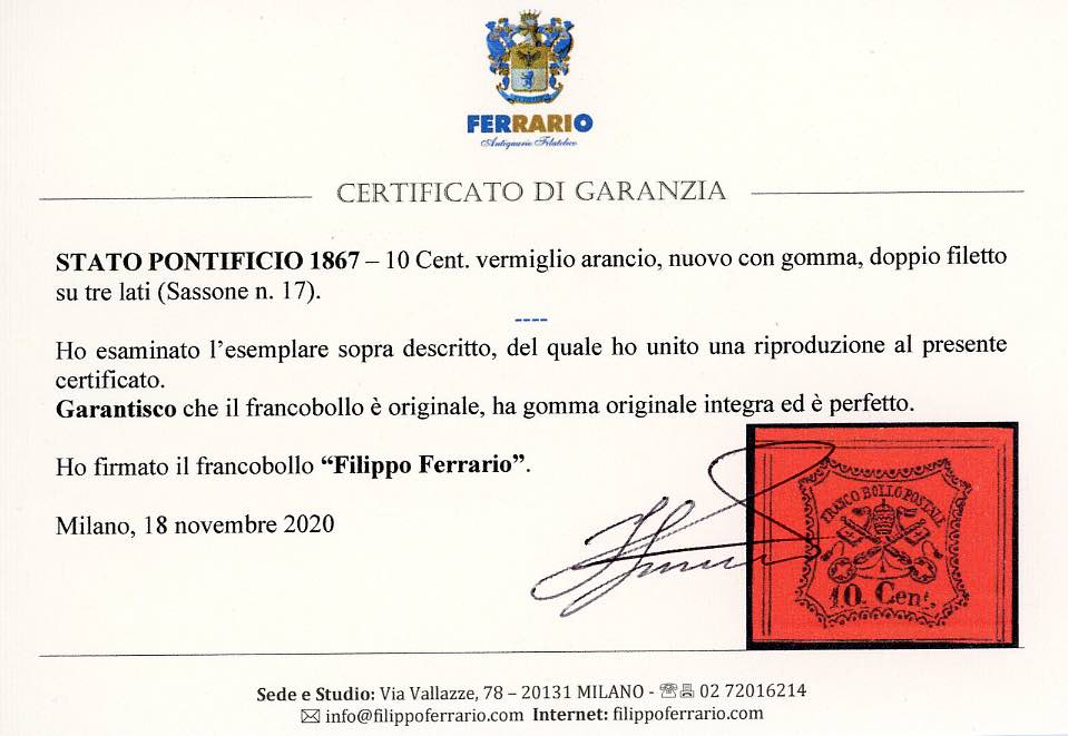 1867 - 10 cent. vermiglio arancio (17), gomma integra, perfetto e con doppio filetto su tre lati. Bello e molto fresco. E.Diena, cert. Ferrario.
