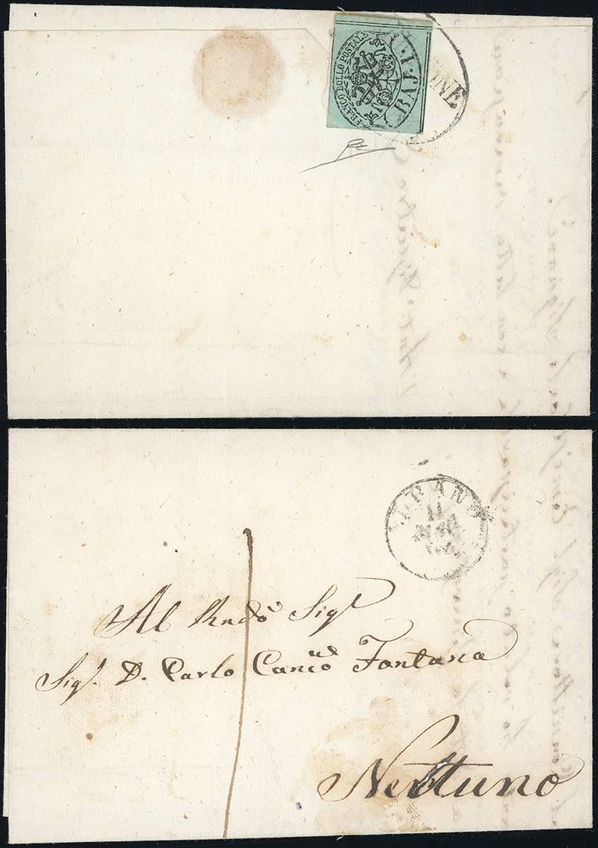 ALBANO, DIREZIONE DI, ovale punti R1 - 1 baj (2), ottimo stato, al verso di lettera del 10/5/1863 per Nettuno, tassata 1 baj. Molto rara. ... Leggi tutto