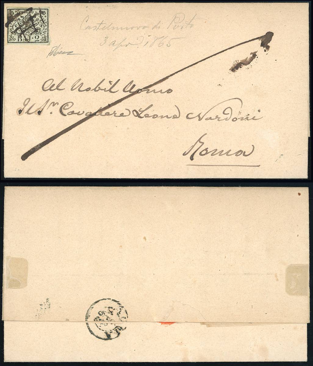 CASTELNUOVO DI PORTO - 2 baj (3Ab), perfetto, su lettera del 3/4/1865 per Roma. Il francobollo venne annullato con il muto a griglia di ... Leggi tutto