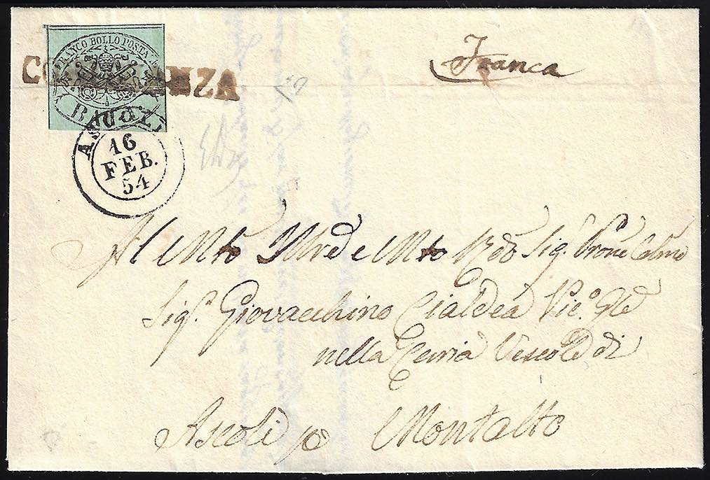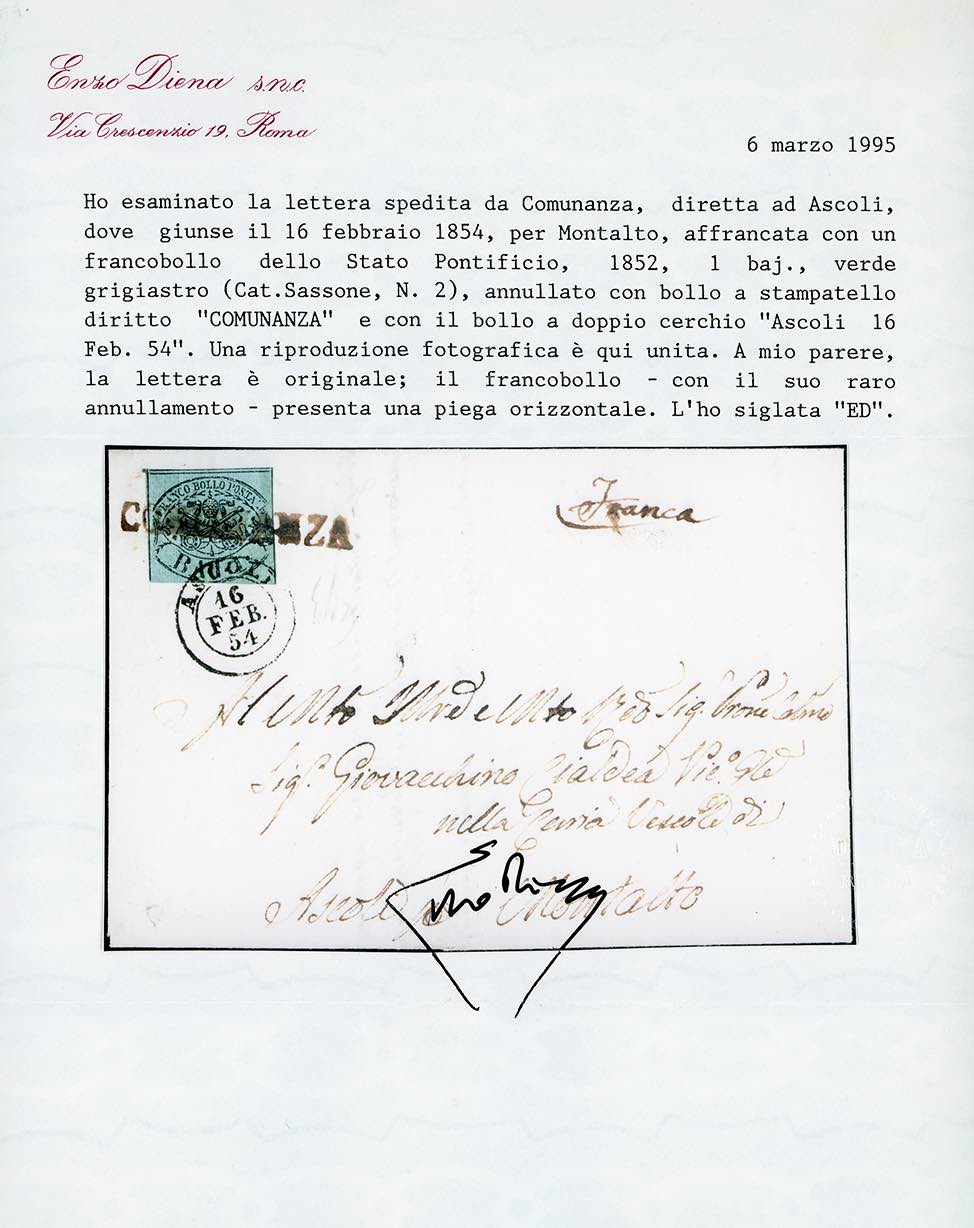 COMUNANZA, punti R2 - 1 baj (2), lieve piega orizzontale, su lettera del 16/2/1854 per Montalto. Annullo molto raro! Em.Diena, cert. E.Diena.