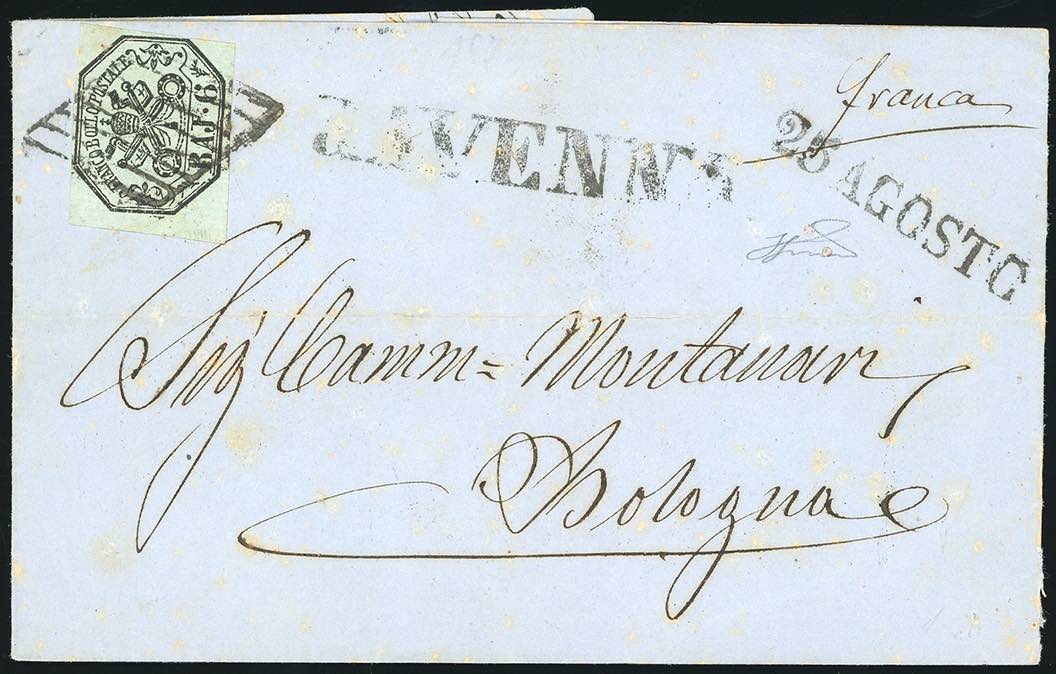 RAVENNA, SD datario in partenza, non catalogato - 6 baj (7), perfetto, su sovracoperta di lettera del 25/8/1858 per Bologna. Raro uso del datario lineare in partenza, segnalato dal cat. Sassone solo in transito o arrivo. Ferrario. Ex coll. Imperato.