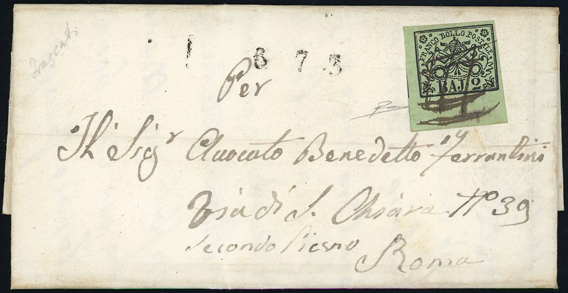 ROMA-FRASCATI - 2 baj (3), bordo di foglio e grandi margini, perfetto, annullato con tratti incrociati di penna, su lettera da Frascati 7/3 ... Leggi tutto