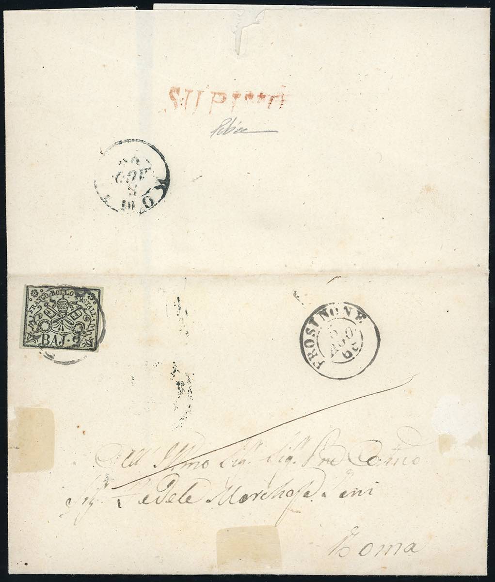 SUPINO, SI rosso punti R2 - 2 baj (3Ab), separato a mano in alto, su sovracoperta di lettera del 5/8/1865 per Roma. Molto raro. R.Diena.