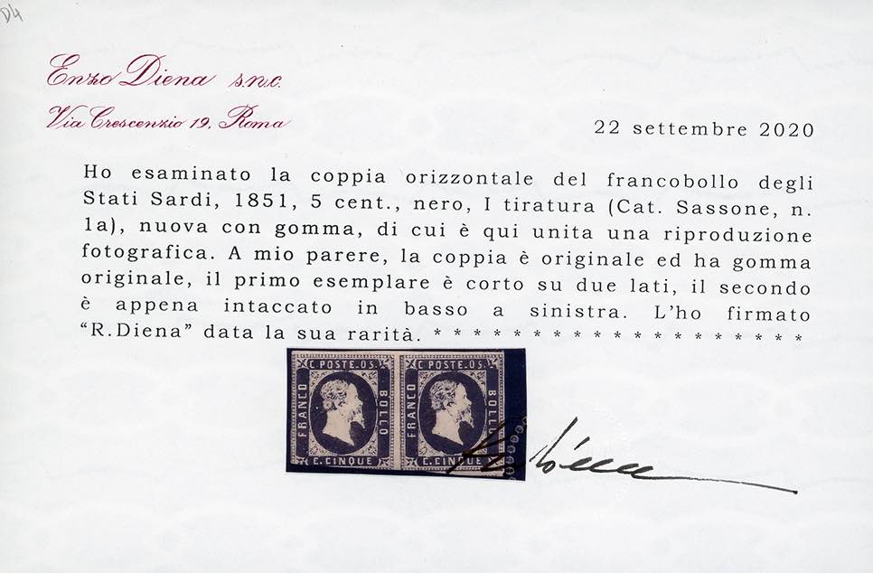 1851 - 5 cent. nero, I riporto (1), coppia orizzontale, gomma originale, difetti di marginatura. Molto rara e di grande freschezza. Cert. ... Leggi tutto