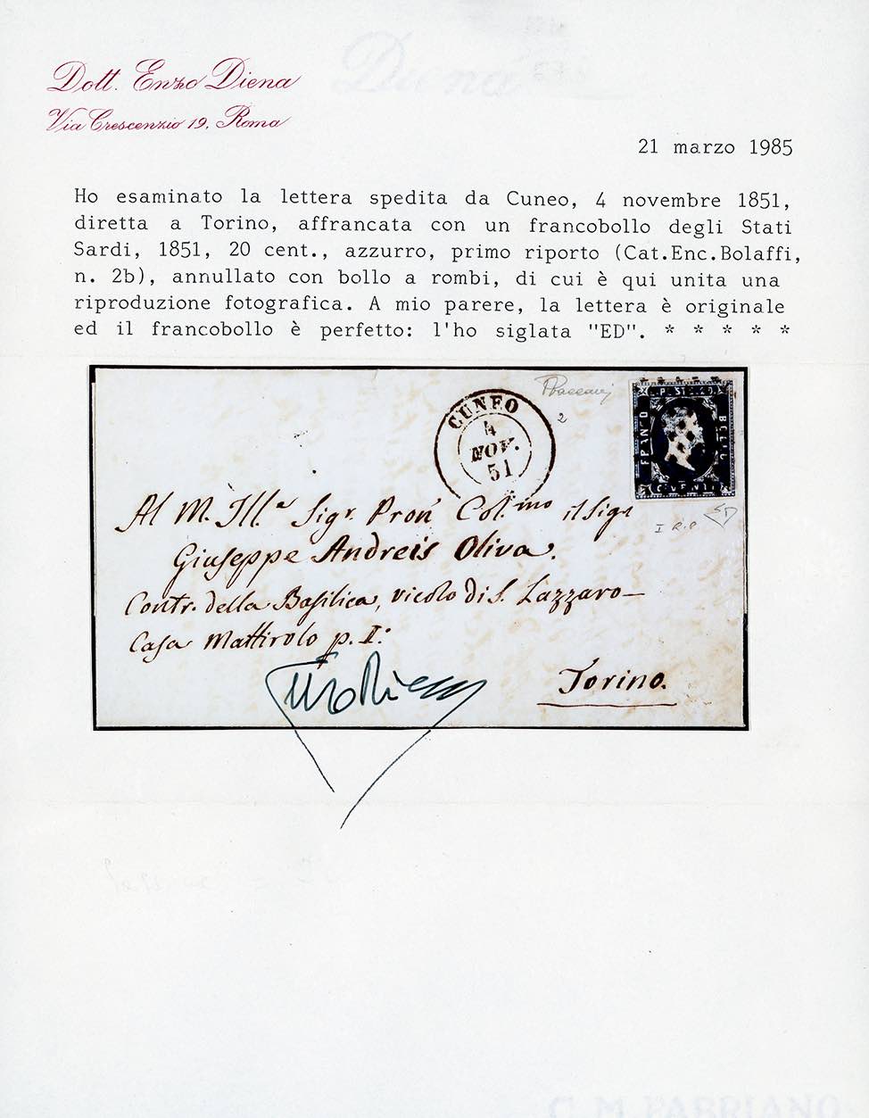 1851 - 20 cent. azzurro scuro, I tiratura, I riporto (2c), perfetto, su sovracoperta di lettera da Cuneo 4/11/1851 a Torino. Bello e raro. Avi, cert. E.Diena e Toselli.