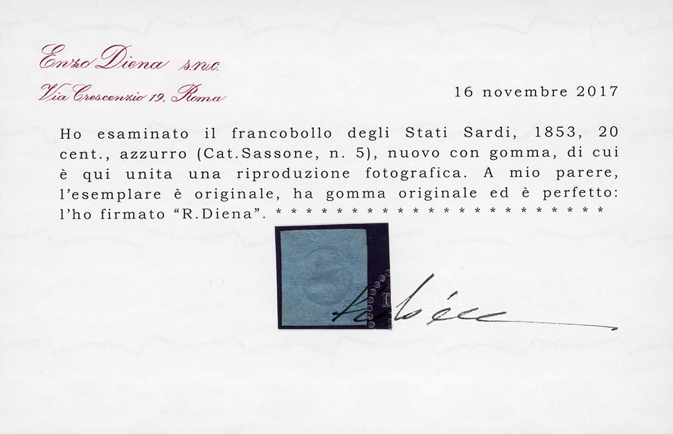 1853 - 20 cent. azzurro (5), gomma originale, perfetto. Raro! E.Diena, Raybaudi, cert. Diena.