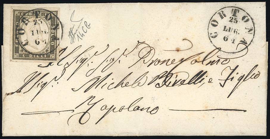 1861 - 10 cent. oliva grigio scurissimo (14Cb), lievissima piega orizzontale, su lettera da Cortona 25/7/1861 a Rapolano. Raro colore. ... Leggi tutto
