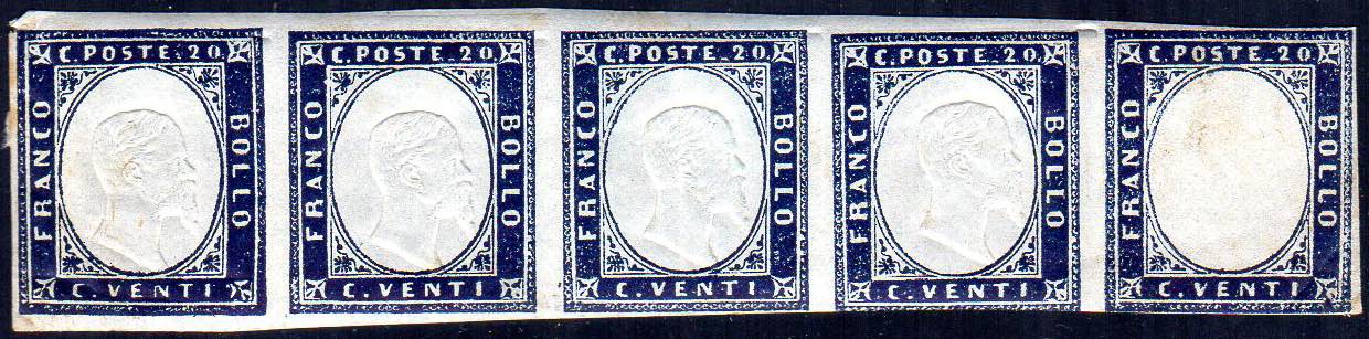 1862 - 20 cent. indaco (15E), striscia orizzontale di cinque, l'ultimo esemplare senza effigie, gomma originale, lievi difetti.