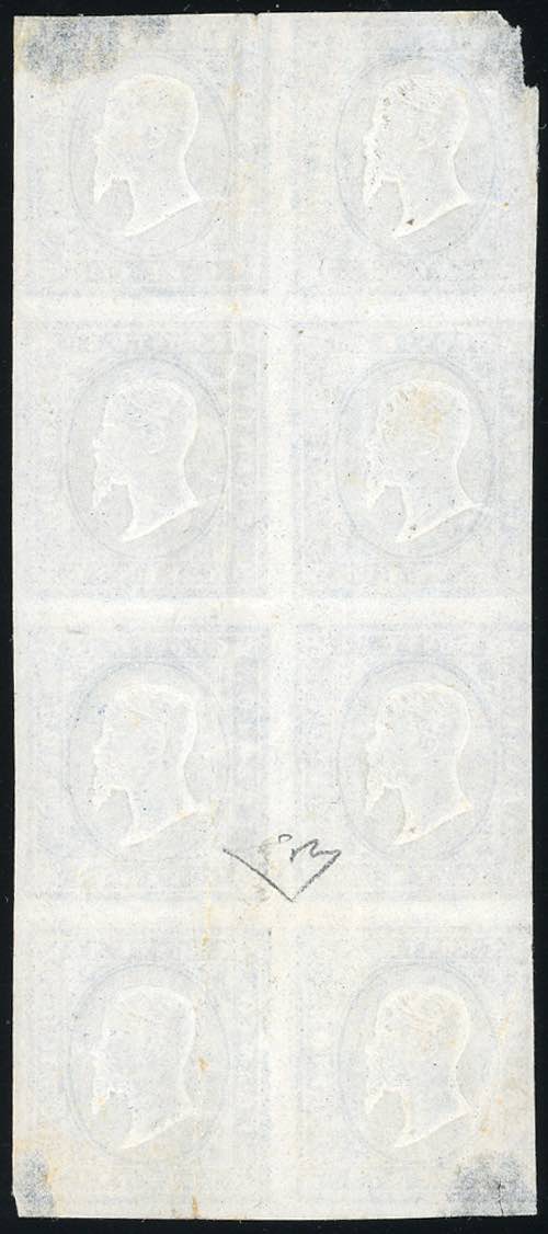 1862 - 20 cent. indaco violaceo scuro, gommato al recto (15Ea), blocco di otto esemplari, lievi difetti. Si tratta del massimo blocco noto ... Leggi tutto