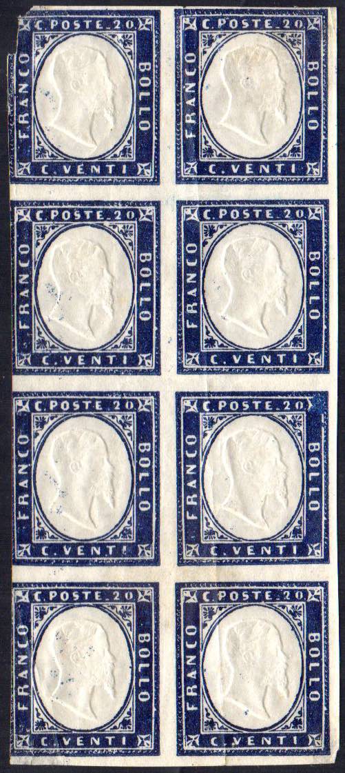 1862 - 20 cent. indaco violaceo scuro, gommato al recto (15Ea), blocco di otto esemplari, lievi difetti. Si tratta del massimo blocco noto di questa rarissima varietà. Inedito! Cert. E.Diena 1992.