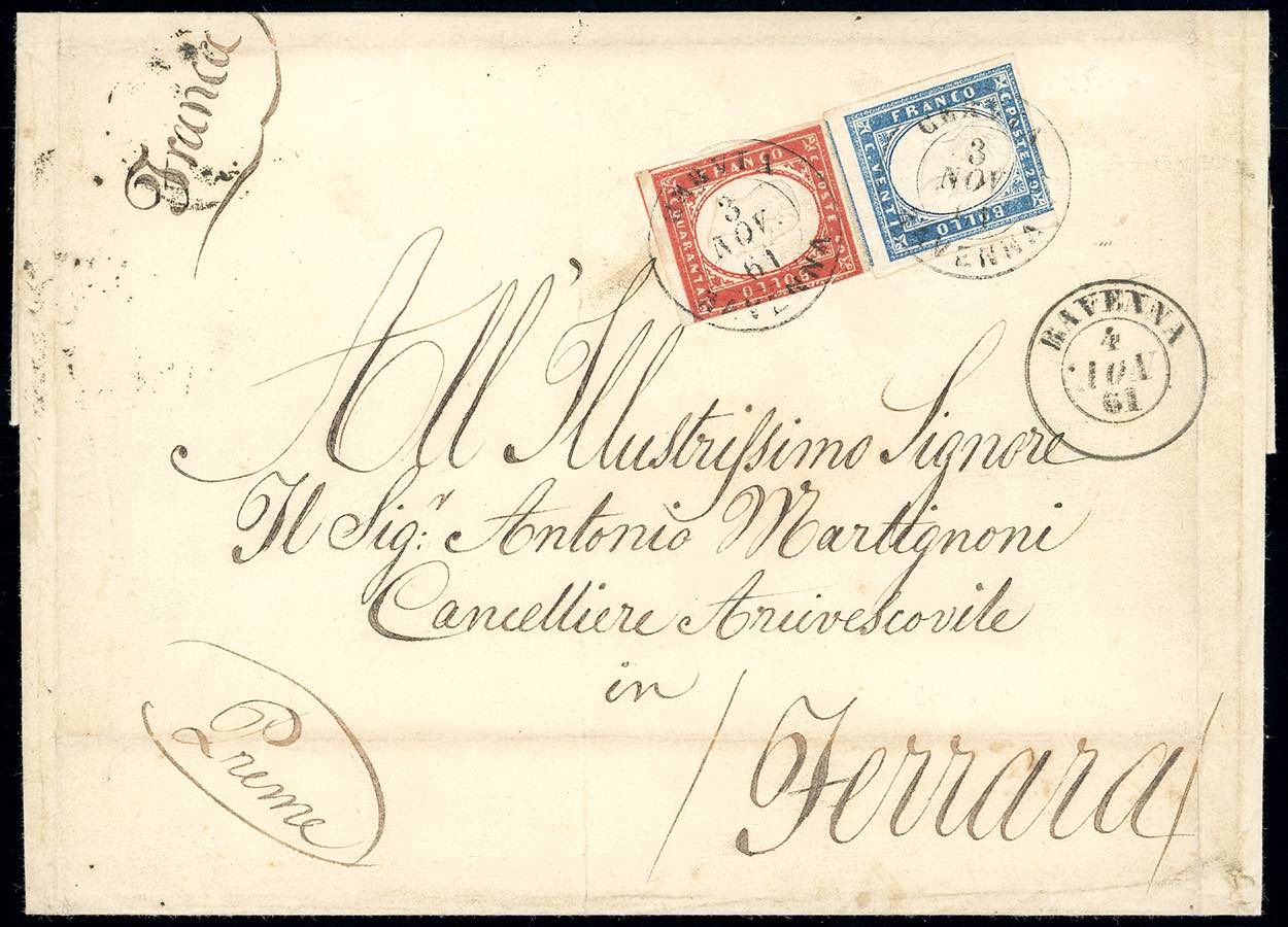 1861 - 40 cent. vermiglio mattone chiaro, 20 cent. celeste chiaro (16Db,15D), difettosi, su sovracoperta di triplo porto da Ravenna 4/11/1861 a Ferrara.