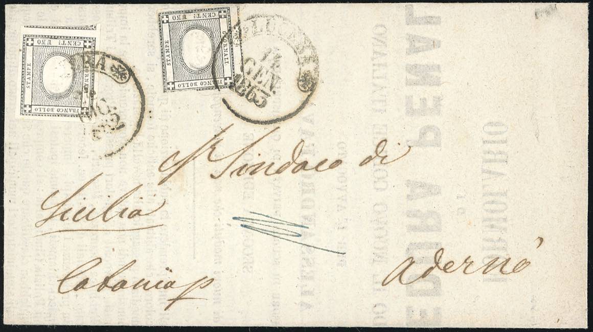 1863 - 1 cent. grigio nero (19), perfetto e ben marginato, su circolare a stampa da Lucera 24/12/1862 a Adernò. A Napoli, bollo al verso del 26/12/1862, venne verificata e risultò essere una stampa non periodica, per la quale era richiesta la tariffa di 2 cent., venne quindi rimandata a Lucera per l'integrazione dell'affrancatura con un altro esemplare da 1 cent. annullato il 14/1/1863 e la missiva giunse finalmente a destino il 18/1/1863. Di grande interesse storico postale.