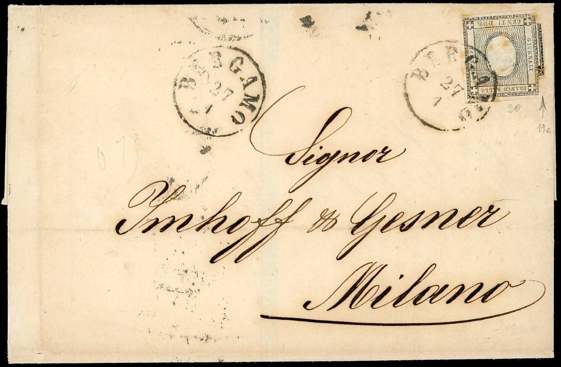 1861 - 2 cent. nero grigiastro, applicato sopra un esemplare da 1 cent. nero intenso, in parte asportato (20,19e), su sovracoperta di circolare da Bergamo 27/1/1861 a Milano. Interessante.