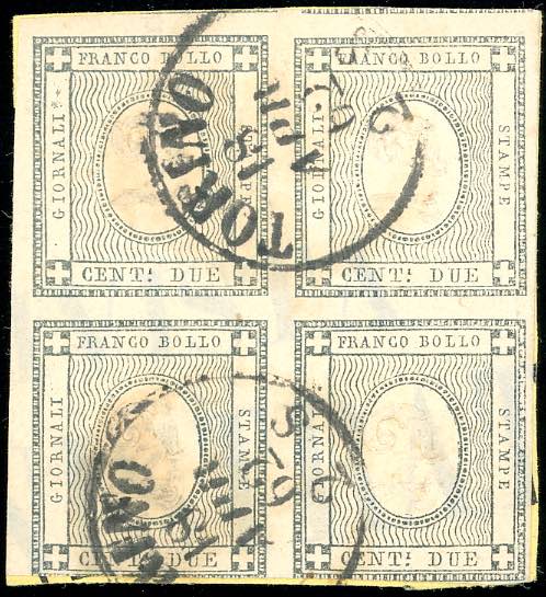 1861 - 2 cent. grigio verdastro (20b), blocco di quattro, intaccato in basso, usato a Torino 18/4/1862.