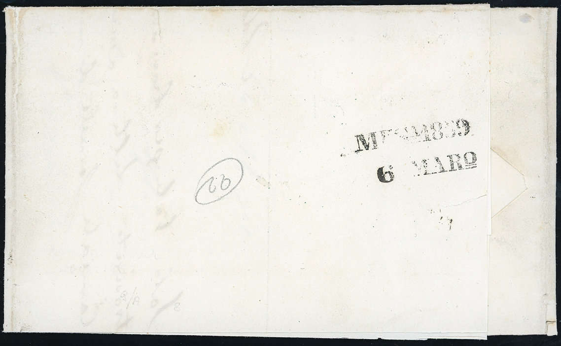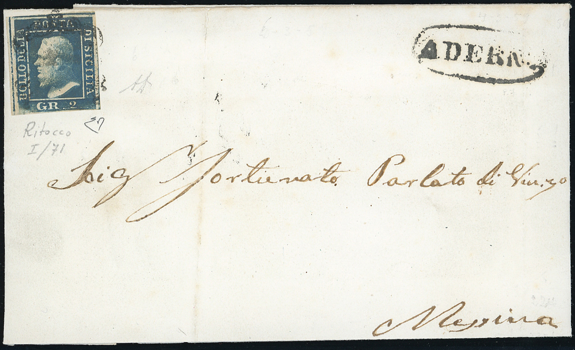 ADERNO', punti 12 - 2 grana, ritocco 71 (6), giusto in basso, su sovracoperta di lettera per Messina 6/3/1859. A. ed E.Diena.