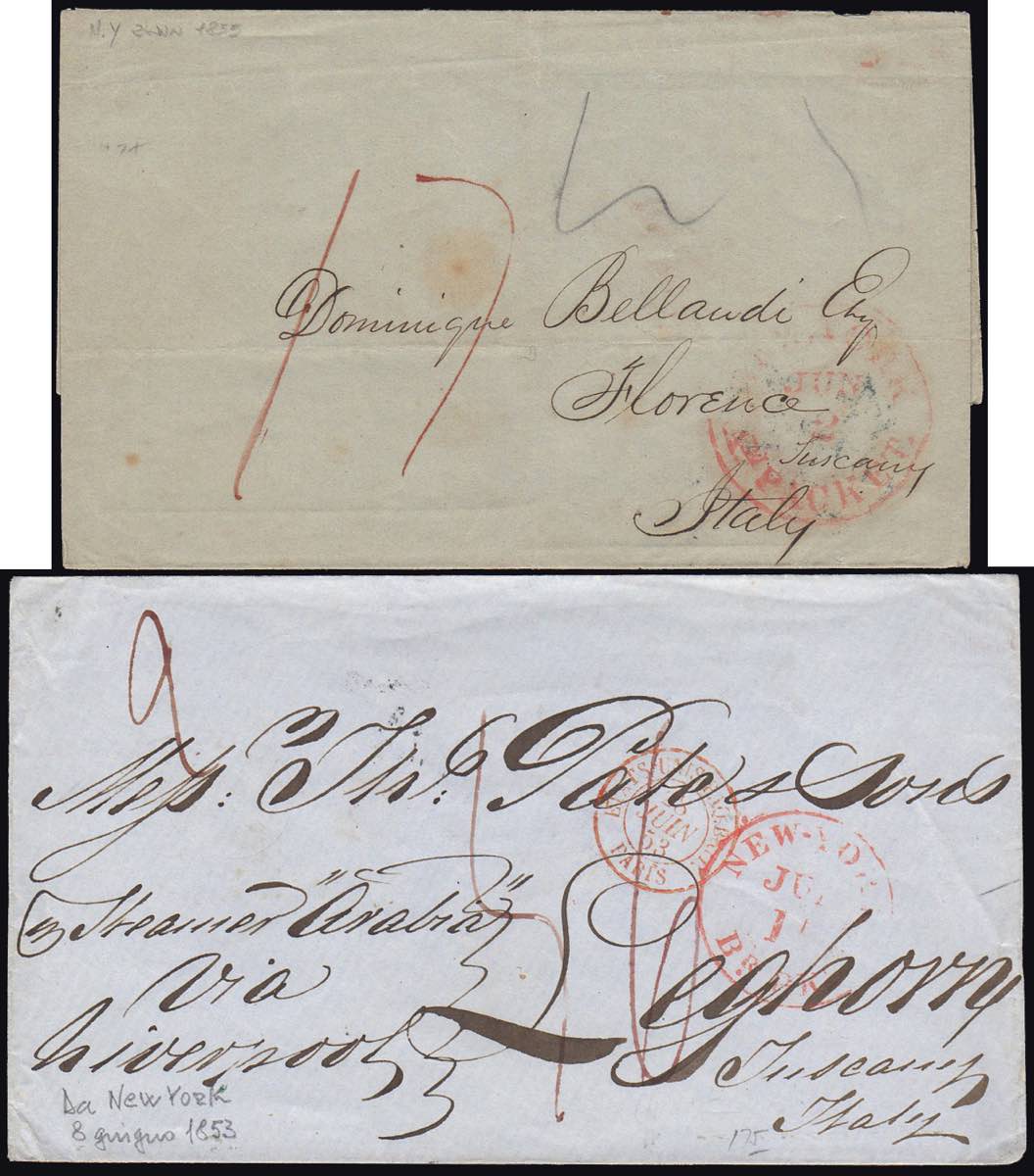 INCOMING MAIL STATI UNITI 1853/55 - Una busta e una sovracoperta di lettera, entrambe non affrancate, spedite da New York alla Toscana, tassazioni diverse in arrivo.
