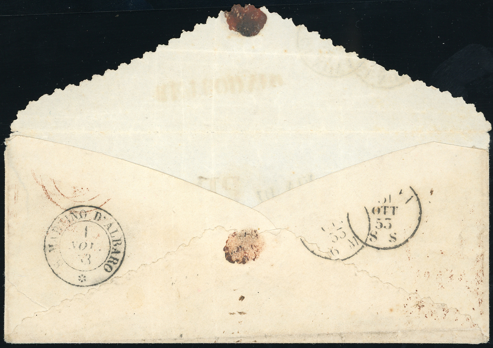 1853 - 6 crazie indaco su azzurro (7a), leggermente intaccato in alto, su busta da Pisa 20/10/1853, muto a rombi rosso punti R1, a Genova, rispedita a San Martino d'Albaro, con applicazione del lineare "RETRODATO" in rosso al verso. Raro insieme.