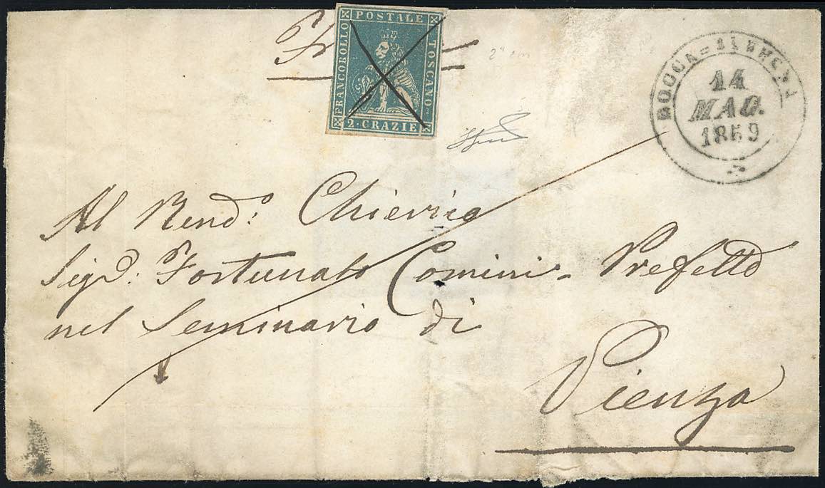 1859 - 2 crazie azzurro (13), ottimo stato, su sovracoperta di lettera incompleta al verso da Roccalbegna 14/5/1859, tratti di penna incrociati sul francobollo, a Pienza. Pregevole uso in periodo di Governo Provvisorio.