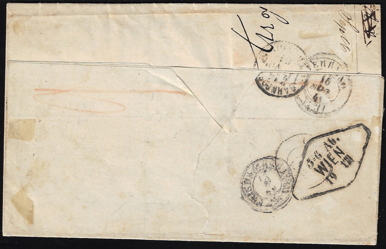 1861 - 20 cent. azzurro (20), striscia di tre, lievi difetti, su lettera da Firenze 14/8/1861 a Vienna, per la VIA DI SVIZZERA. Rara! Ferrario.