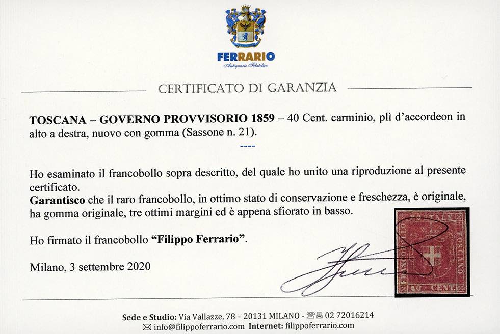 1859 - 40 cent. carminio (21), plì d'accordeon in alto, tre ottimi margini, sfiorato in basso, gomma originale, perfetto. Raro e molto fresco. Cert. storico A.Diena e Ferrario.