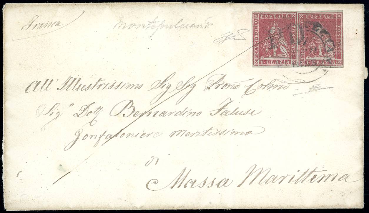 MONTEPULCIANO, doppio cerchio grande PD coannullatori combinazione non catalogata - 1 crazia (4d), coppia, perfetta, su sovracoperta di lettera del 17/2/1853 per Massa Marittima. R.Diena, Ferrario.