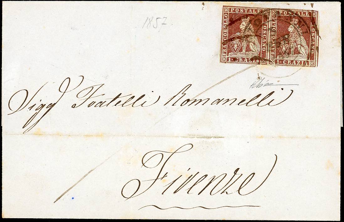 SAN GIOVANNI, doppio cerchio grande penna punti 11 - 1 crazia (4e), coppia, margini rasenti, su sovracoperta di lettera del 3/02/1857 per Firenze. R.Diena.