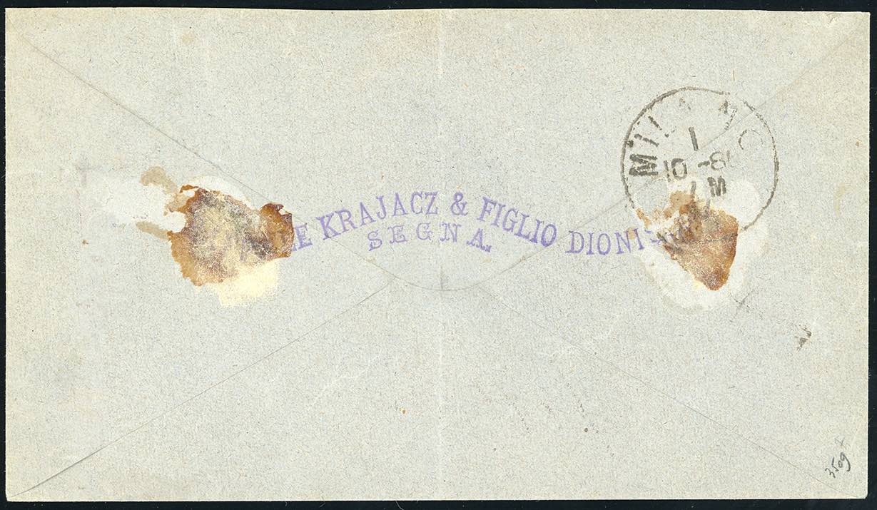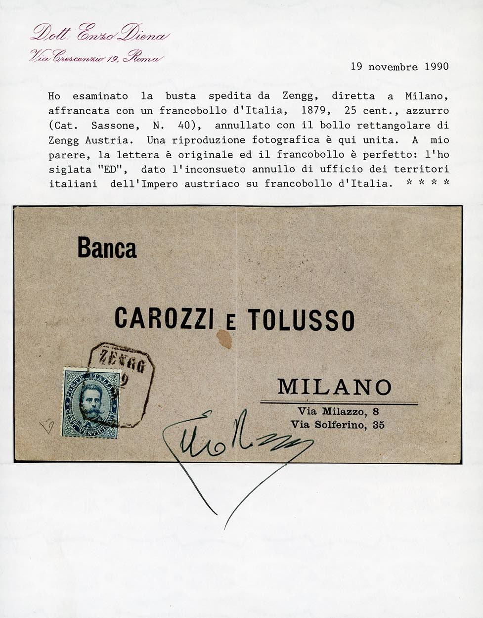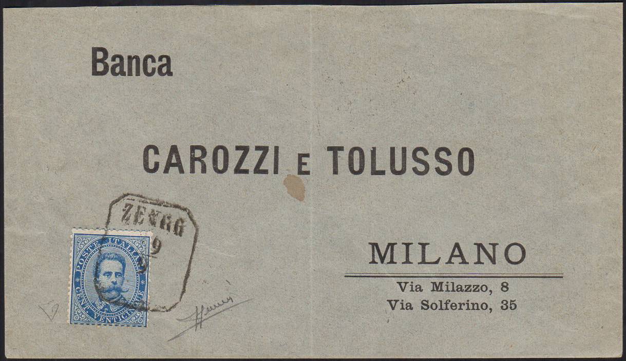 1880 - 25 cent. azzurro, Umberto I (40), perfetto, usato su busta diretta a Milano, annullato con il bollo ZENGG 19/9 del 1880, di ... Leggi tutto