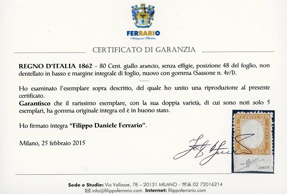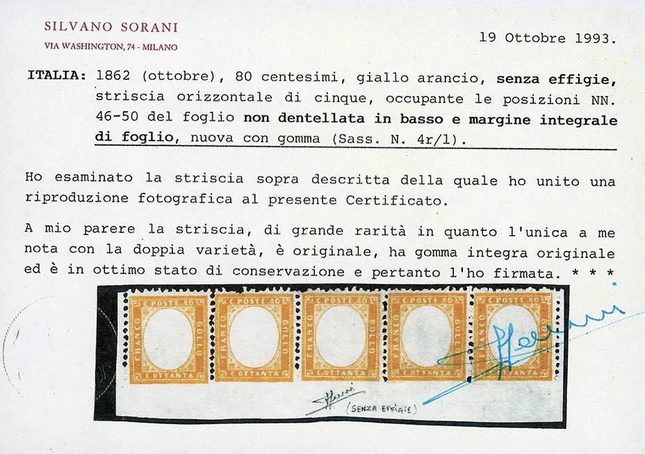 1862 - 80 cent. giallo arancio, SENZA EFFIGIE, non dentellato in basso e con margine integrale di foglio, pos. 48 (4ra), gomma integra, buono stato. Rarità del settore, cinque esemplari noti! E.Diena, cert. Ferrario e fotocopia cert. Sorani della striscia di provenienza.