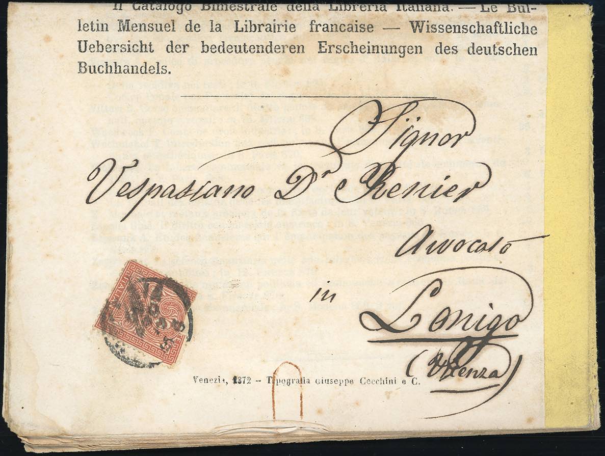 1872 - 2 cent. De La Rue, tiratura di Torino (T15), "ricomposto" parzialmente in frode, su stampato da Venezia 30/8/1872 a Lorigo.