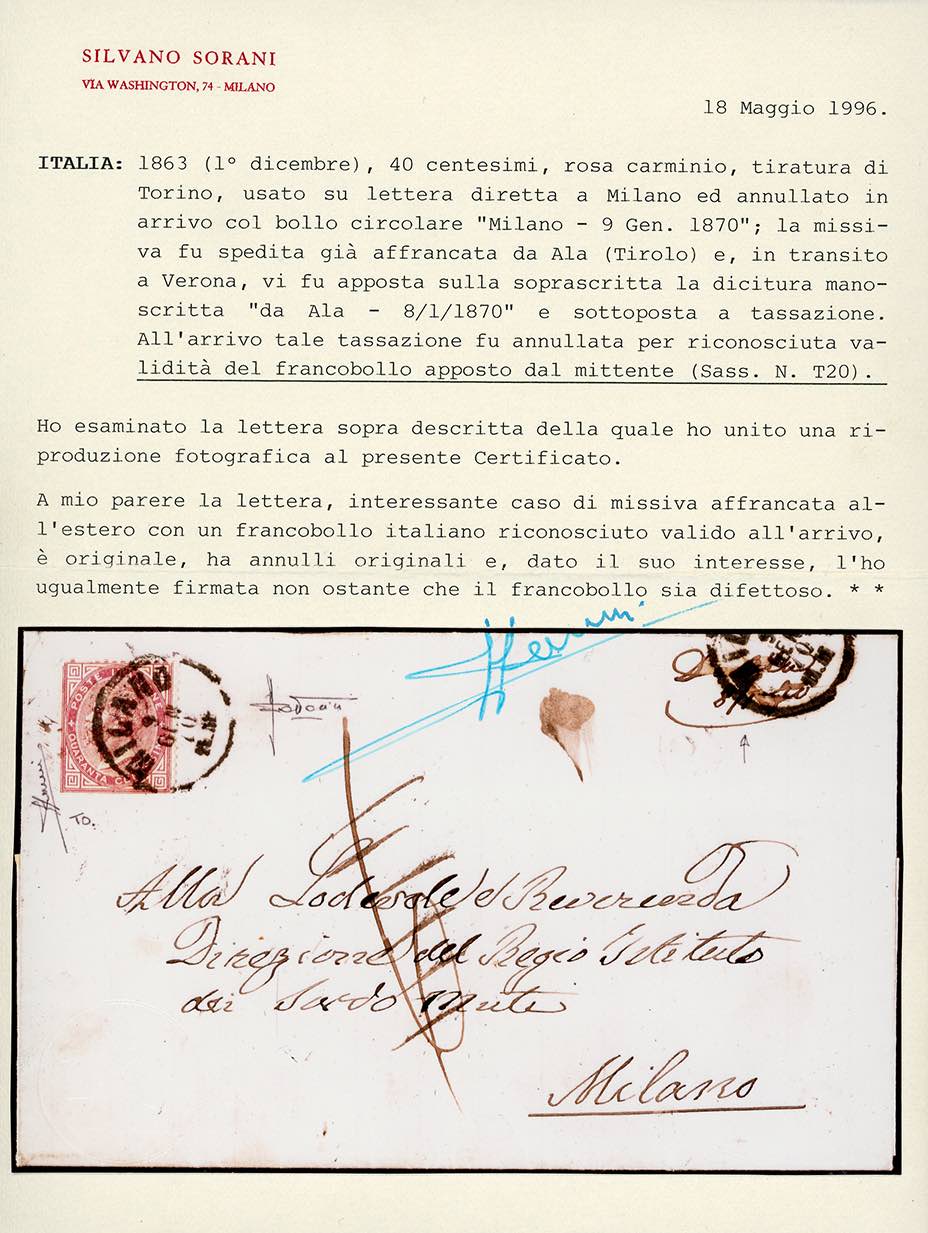 1870 - 40 cent. De La Rue, tiratura di Torino (T20), francobollo separato con le forbici, su lettera da Ala 8/1/1870 a Milano, annullata in arrivo, tassata e detassata. Eccezionale documento spedito già affrancato con francobollo italiano dal Tirolo ancora austriaco e affrancatura ritenuta valida in Italia. Rarità! Cert. Sorani e Sottoriva.