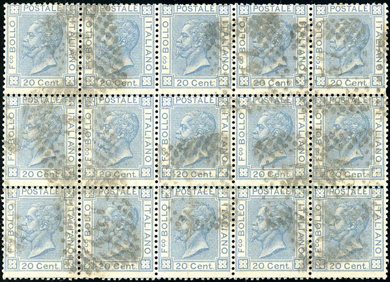 1867 - 20 cent. azzurro, tiratura di Torino (T26), blocco di 15 esemplari usato, lievi difetti su alcuni esemplari, ottimo aspetto. Rarissimo! Cert. Ferrario.