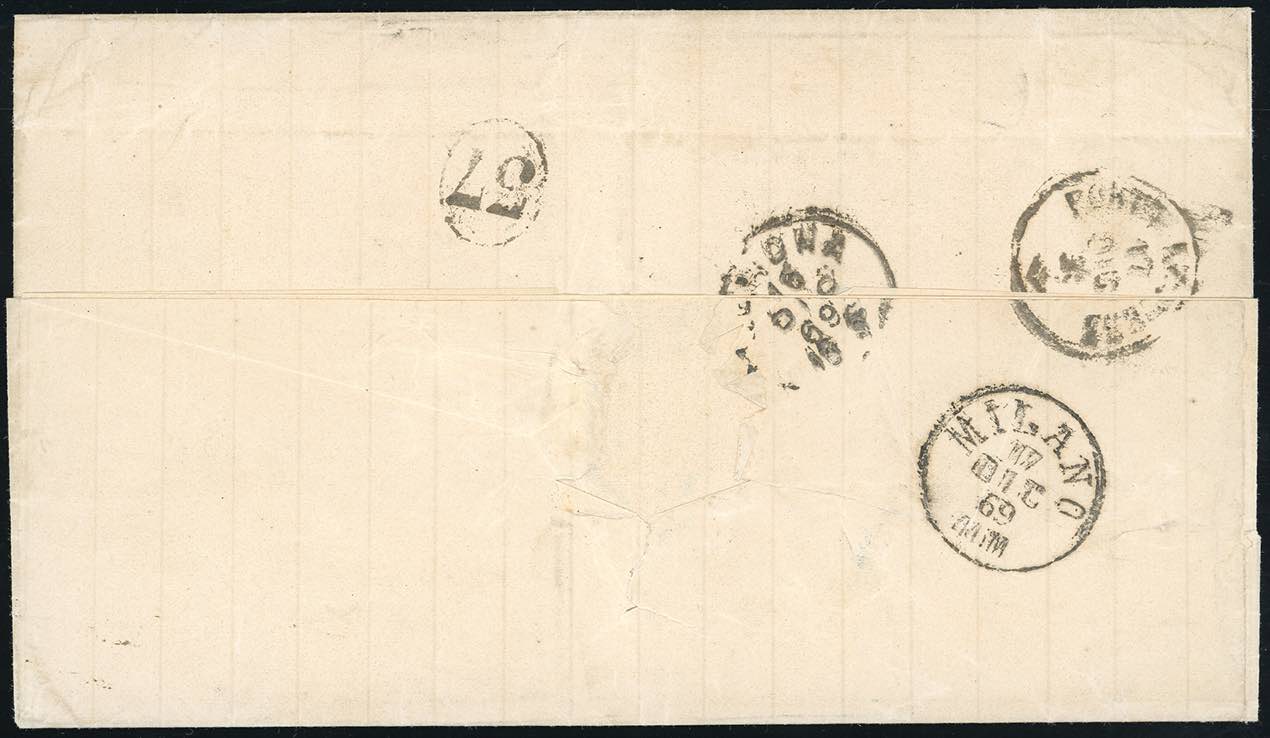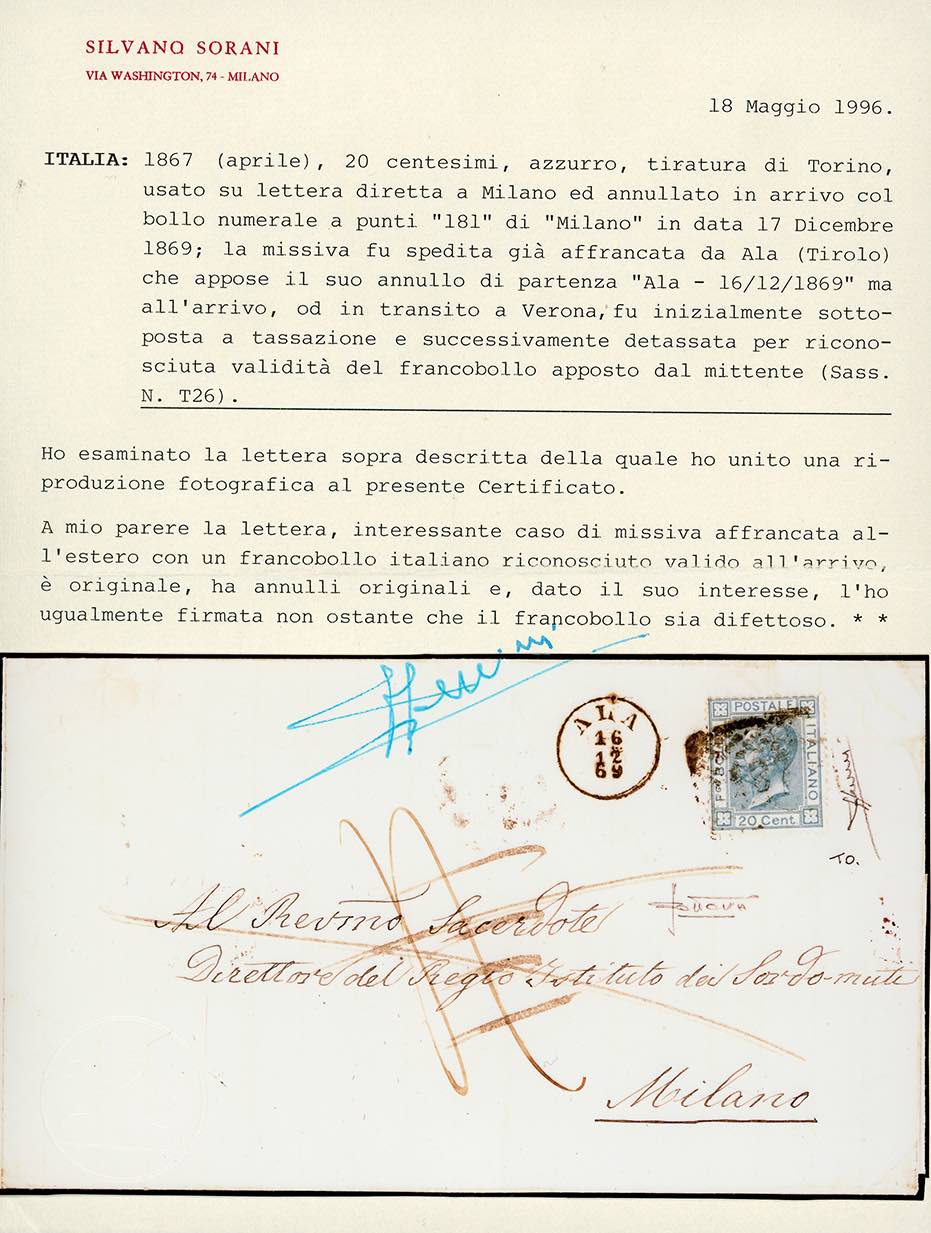 1869 - 20 cent. azzurro, tiratura di Torino (T26), difetti, su lettera da Ala 16/12/1869 a Milano, annullato in arrivo, tassata e detassata. Eccezionale documento spedito già affrancato con francobollo italiano dal Tirolo ancora austriaco e affrancatura ritenuta valida in Italia. Rarità. Cert. Sorani e Sottoriva.