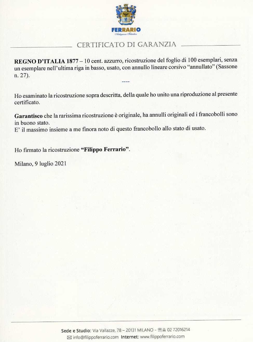 1877 - 10 cent. azzurro (27), foglio quasi completo, manca solo un esemplare, usato con il lineare corsivo "annullato". INSIEME UNICO E DI ECCEZIONALE RARITA'. Da esposizione. A.Diena, cert. Ferrario.