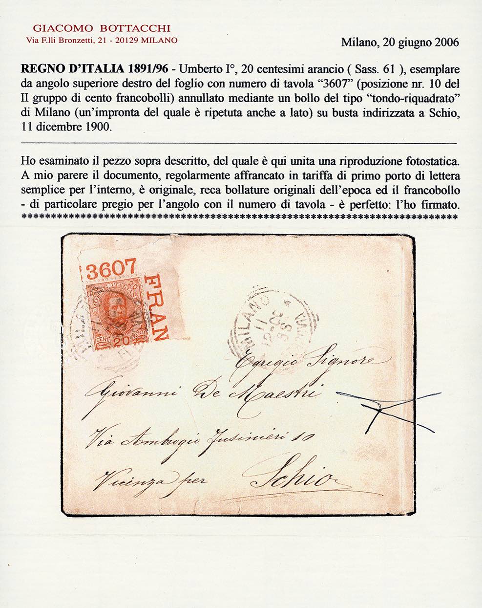 1900 - 20 cent. Umberto I (61), angolo di foglio con NUMERO DI TAVOLA, perfetto, su busta da Milano 11/10/1900 a Schio. Molto rara! Ferrario, cert. Bottacchi.