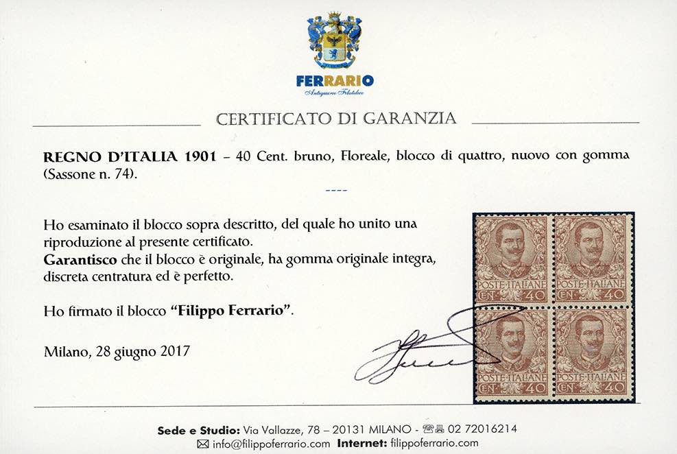 1901 - 40 cent. Floreale (74), freschissimo blocco di quattro, gomma originale integra, perfetto e di discreta centratura. Raybaudi. Cert. ... Leggi tutto