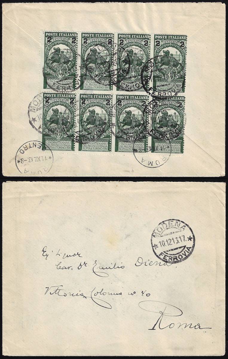 1913 - 2 cent. su 5 cent. Unità d'Italia (99), blocco di otto esemplari, perfetto, al verso di busta da Modena 10/12/1913 a Roma.