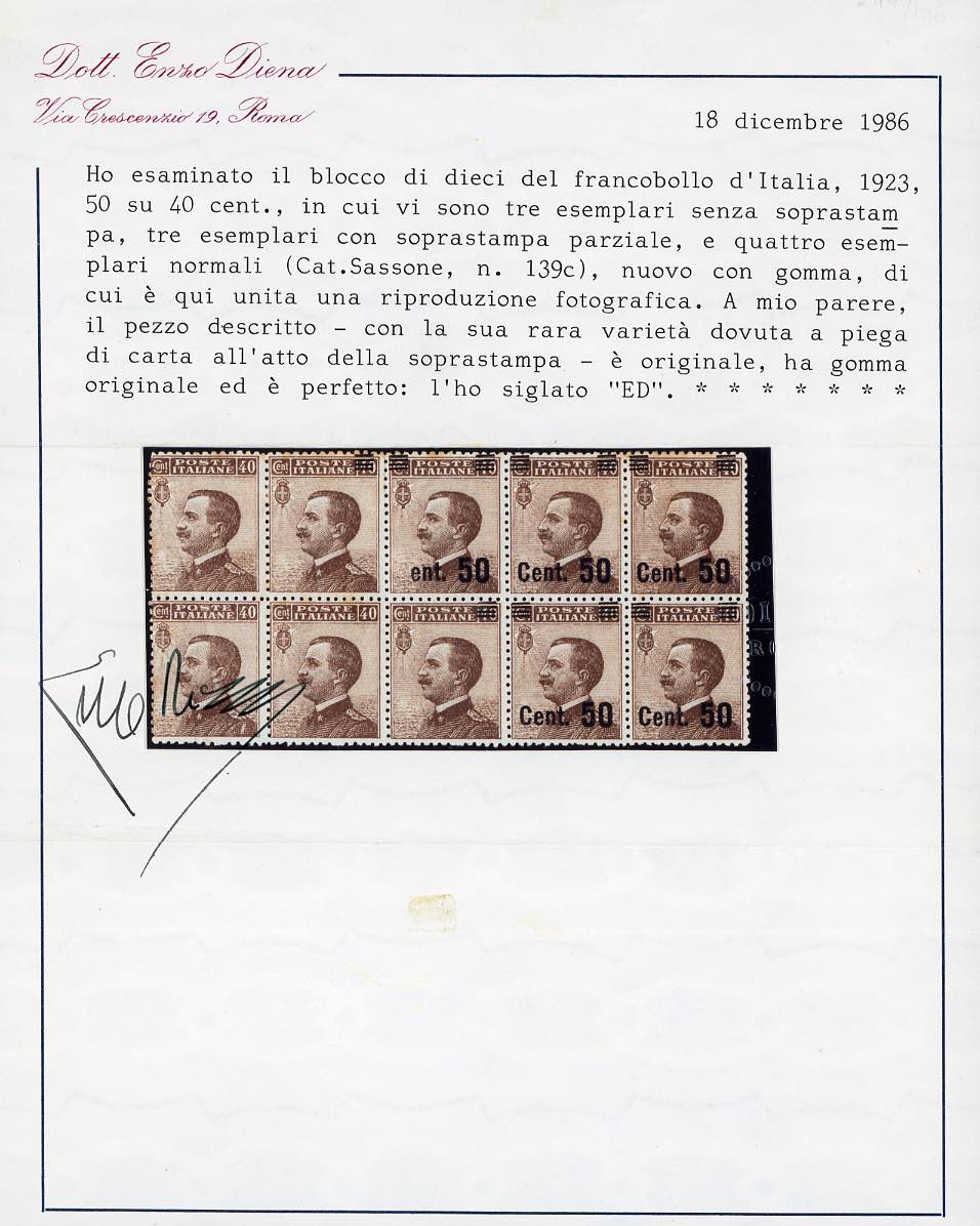 1923 - 50 su 40 cent. Michetti (139), blocco di dieci esemplari, due con soprastampa parziale solo al verso, uno totalmente privo, uno con solo sbarrette, uno senza C di CENT. ed uno in coppia con e senza stampa, gomma originale, integra per alcuni esemplari, lievi ossidazioni. Insieme rarissimo! Cert. Diena.